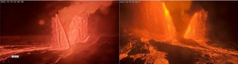 L'épisode 35 de l'éruption en cours du Kilauea a débuté vers 20h05, heure locale, le 17 octobre 2025 (8h05 le 18 octobre heure française) avec des fontaines de lave qui ont commencé à jaillir de la bouche nord, après environ 30 minutes de débordements continus de lave dégazée. Elles ont rapidement atteint environ 150 m de hauteur lorsque la bouche sud est entrée en éruption à 20h50. Les fontaines de la bouche sud ont encore grandi et, en 20 minutes, ont égalé la taille de la bouche nord. Les deux fontaines ont continué à s'élever et, à 21h30, elles dépassaient 300 m. Vers 22h, la fontaine de la bouche sud approchait les 500 m de hauteur et celle de la bouche nord dépassaient les 330 m. Il s'agirait de la fontaine la plus haute, seule ou avec deux fontaines, observées lors de cette éruption. Des fontaines hautes et soutenues ont continué de jaillir des deux bouches. Le panache de gaz au-dessus des fontaines s'étendait à plus de 5000 m d'altitude. La Protection civile d'Hawaï a signalé des téphras tombant sur la route 11, au sud-ouest des évents. Le sommet s'est dégonflé d'environ 7 microradians, mesuré par l'inclinomètre Uēkahuna, en environ 2 heures.